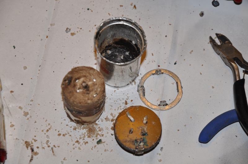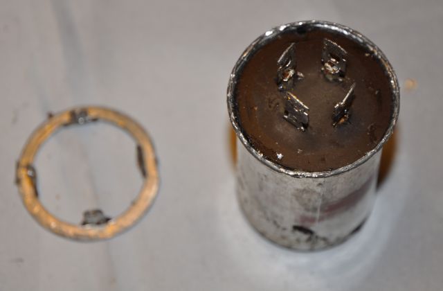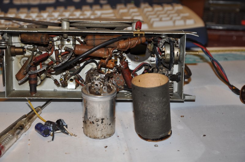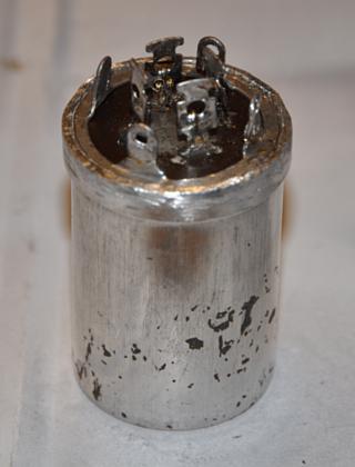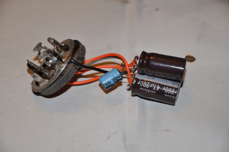 Был обнаружен лишь полностью нерабочий блок электролитических конденсаторов. В одном корпусе собрали аж 4 конденсатора - 30+30+20мф х 150в + 30мф х 25в. По отработаной методике он был перепакован без нарушения внешней аутентичности. Процесс восстановления этого непростого конденсатора вынесен отделно. Как перепаковать электролитический конденсатор